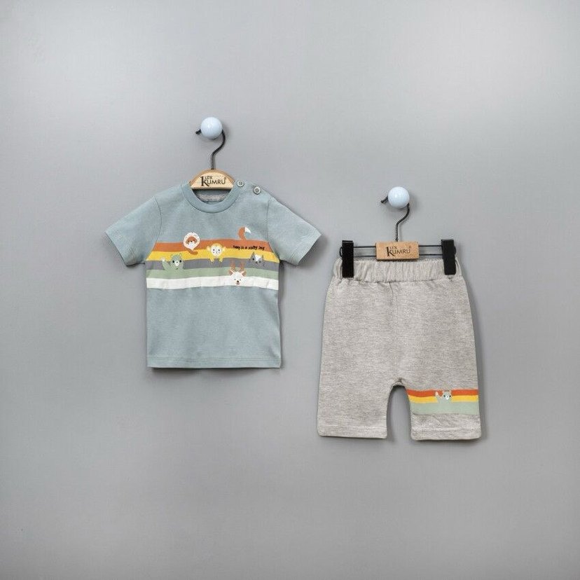 Gri kısa kollu, yuvarlak yaka baskılı üst ve çizgili detaylı gri şort içeren yumuşak ve sıcak kumaştan bebek erkek takım.