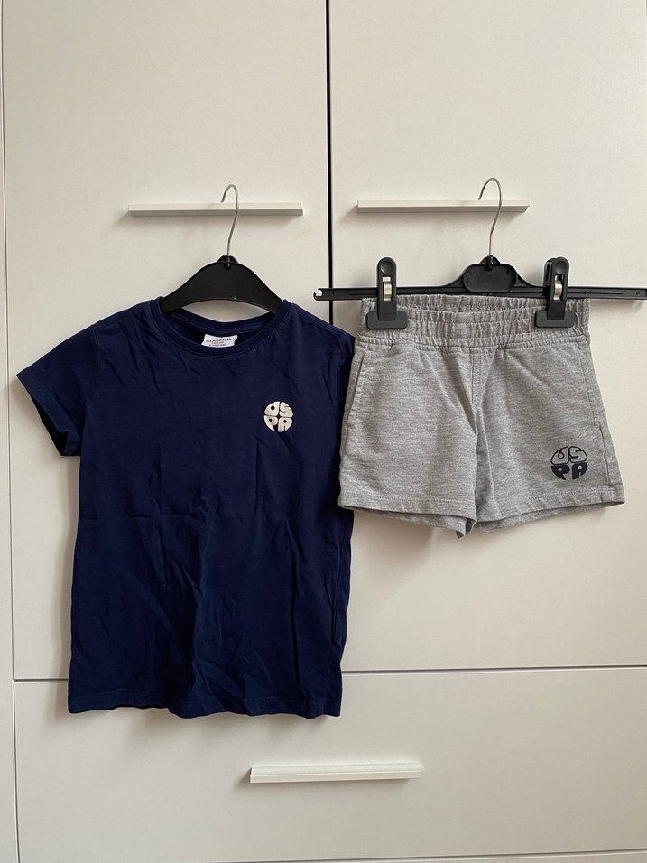 Pamuklu, kısa kollu, bisiklet yaka lacivert tişört ve elastik bel gri baskılı şortlu erkek bebek takımı. Üzerindeki leke yıkanarak geçebilir