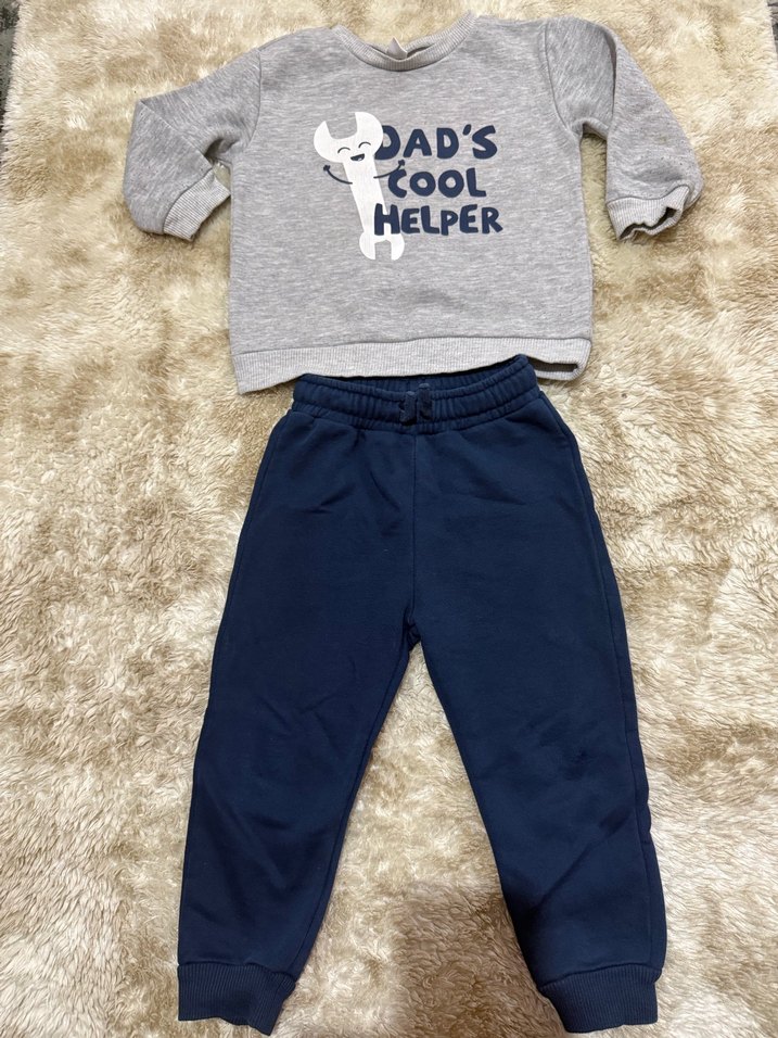 Gri kapüşonsuz uzun kollu üst, "Dad's Cool Helper" baskılı, örme dokulu, lacivert pantolonla takım. Yumuşak ve sıcak kumaştan, sokak stiline uygun.