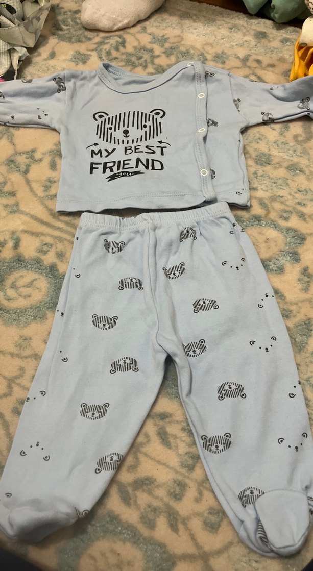 Gri renkli, uzun kollu ve düğmeli yan kapanışlı, yumuşak ve sıcak kumaştan yapılmış erkek bebek takımı. Üstünde 'MY BEST FRIEND' yazısı ve baskılı ayı desenleri bulunur.