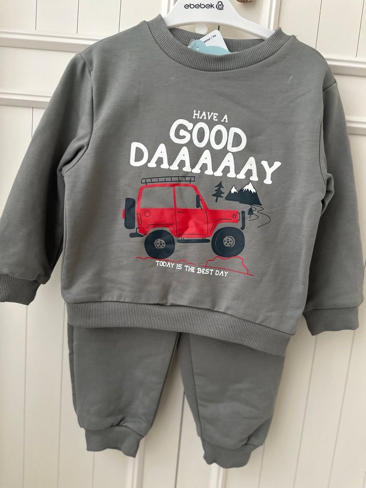 Gri renkli, uzun kollu, yuvarlak yakalı ve kırmızı araba baskılı üst ile birlikte yumuşak ve sıcak kumaştan yapılmış eşofman altından oluşan erkek bebek takımı. Sokak stili için uygun. 18-24 ay