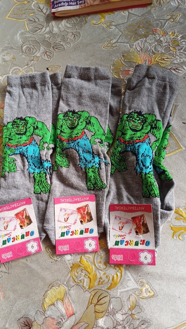 Gri zemin üzerinde canlı baskılı yeşil süper kahraman figürlü erkek çocuk çorapları, yumuşak ve rahat yapıda. 9 yaş