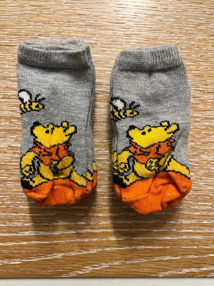 Gri renkte, üzerinde sarı ayı ve arı baskısı bulunan erkek çocuk çorabı. Ayak kısmı turuncu renklidir.