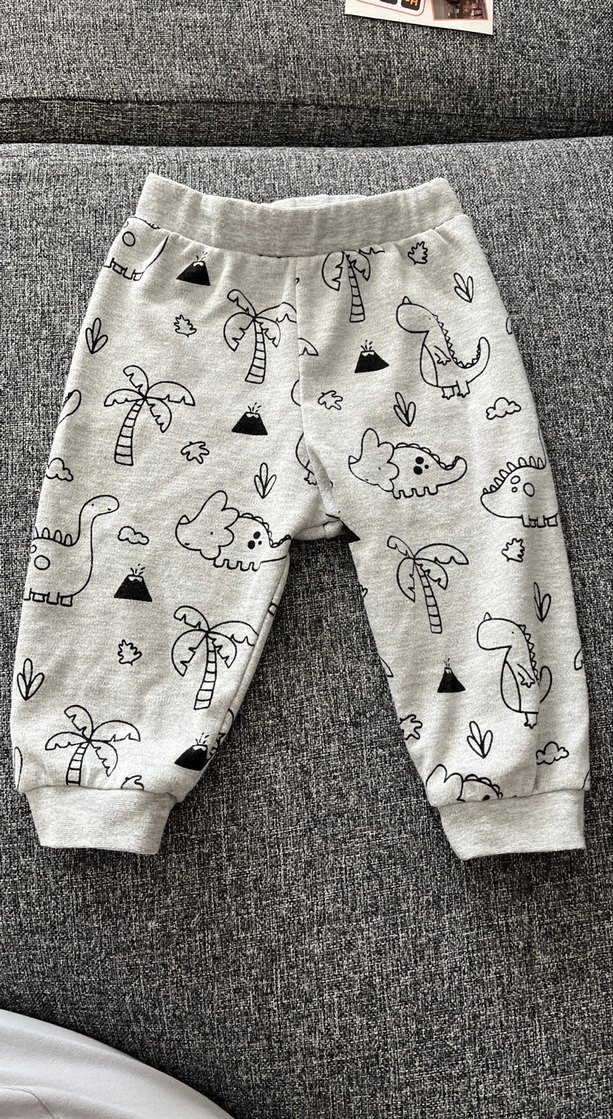 Gri pamuklu kumaştan, baskılı dinozor ve palmiye desenli, rahat kesim erkek çocuk eşofman altı. Örme kumaşıyla konfor sağlar.