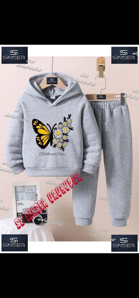 Gri, bol kesim erkek çocuk eşofman takımı, örme dokulu ve sarı kelebek ile çiçek baskılıdır. Yumuşak ve sıcak kumaştan, bisiklet yaka kapüşonlu, Sinser markasıdır.