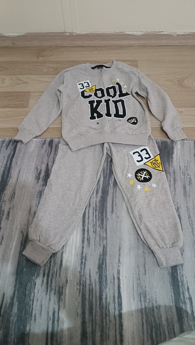 Gri renkli, baskılı ve örme kumaştan yapılmış, bol kesim erkek çocuk eşofman takımı. Üstü bisiklet yaka ve 'COOL KID' yazılıdır.