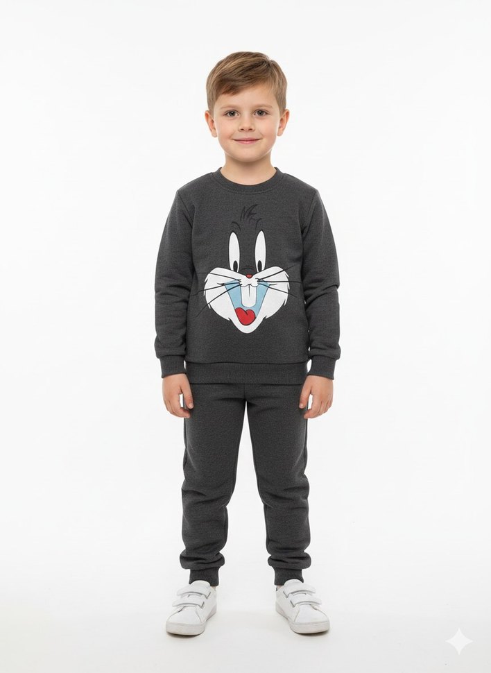 Gri renkli, baskılı ve kabartmalı tasarıma sahip, rahat kesim erkek çocuk eşofman takımı. Yumuşak ve sıcak kumaştan üretilmiştir, sokak stili için uygundur.