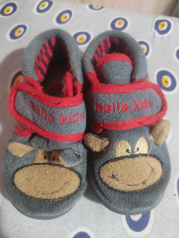 Gri baskılı, yumuşak ve sıcak kumaştan erkek çocuk ev terliği. Velcro bantlarla kolay kullanım sağlar.