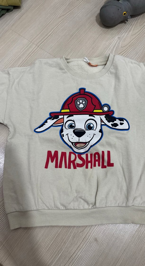 Gri renkli, kısa kollu erkek çocuk sweatshirtü, rahat kesimli ve yumuşak kumaşlıdır. Önünde Marshall baskısı bulunur.