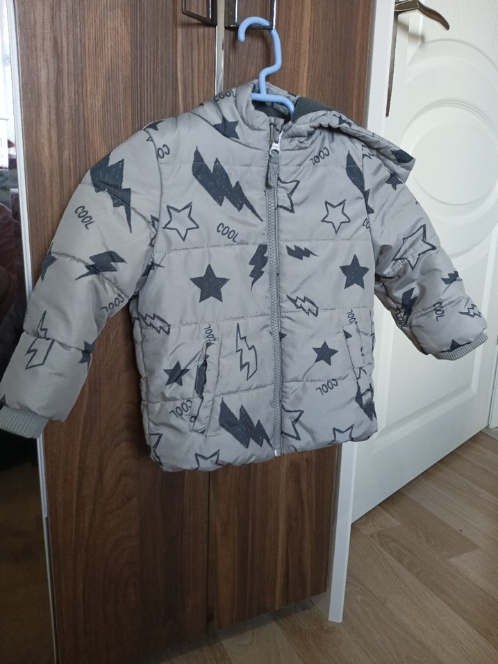 Gri renkte, yıldız ve şimşek baskılı, kürk detaylı, dar kesim erkek çocuk montu. Notch yaka ile dikkat çeker, trend sokak tarzına uygun.