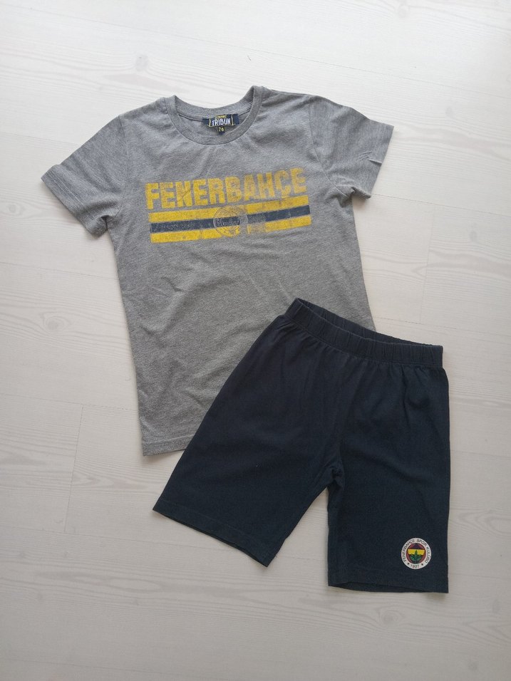 Gri baskılı, bol kesim erkek çocuk eşofman takımı, yuvarlak yaka ve rahat kesim. Yumuşak kumaş ve elastik bel detaylı lacivert şort içerir. 'FENERBAMCE' yazısı bulunur.