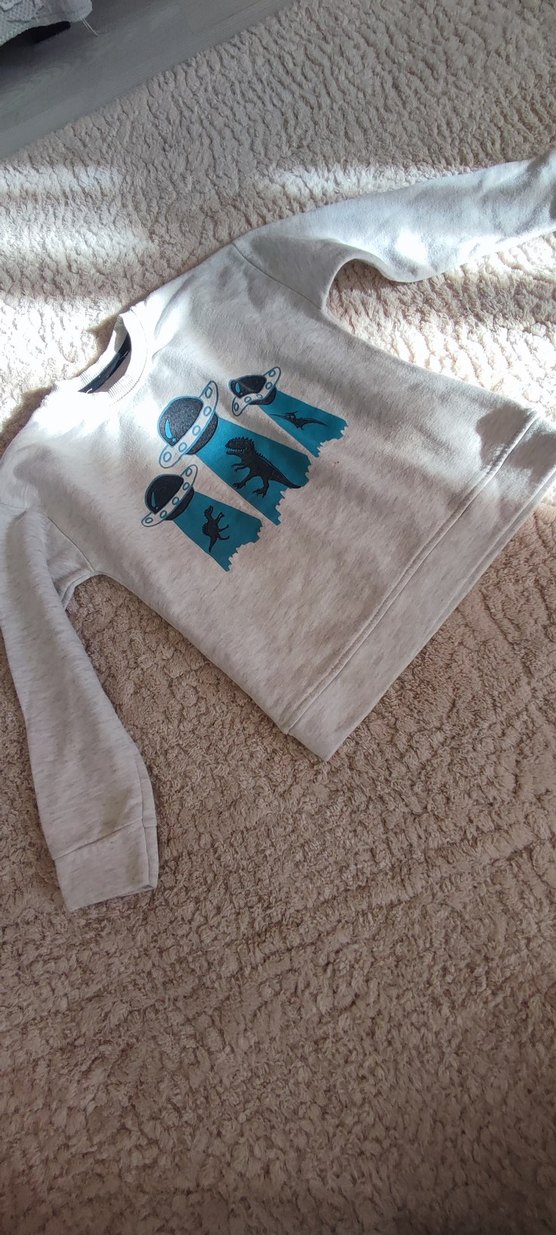 Gri renkte, yuvarlak yakalı ve uzun kollu, bol kesim erkek çocuk sweatshirtü. Yumuşak, örme kumaştan üretilmiş ve UFO ile hayvan baskıları içerir. ikili fiyatı