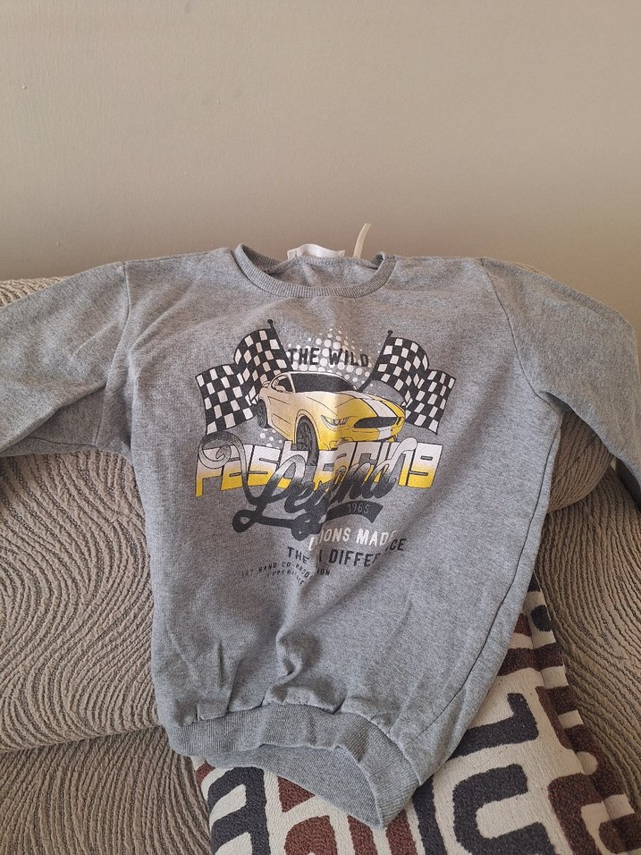 Uzun kollu, bisiklet yaka, bol kesim gri sweatshirt. Baskılı yarış arabası deseni ve örme dokusu ile rahat ve şık.