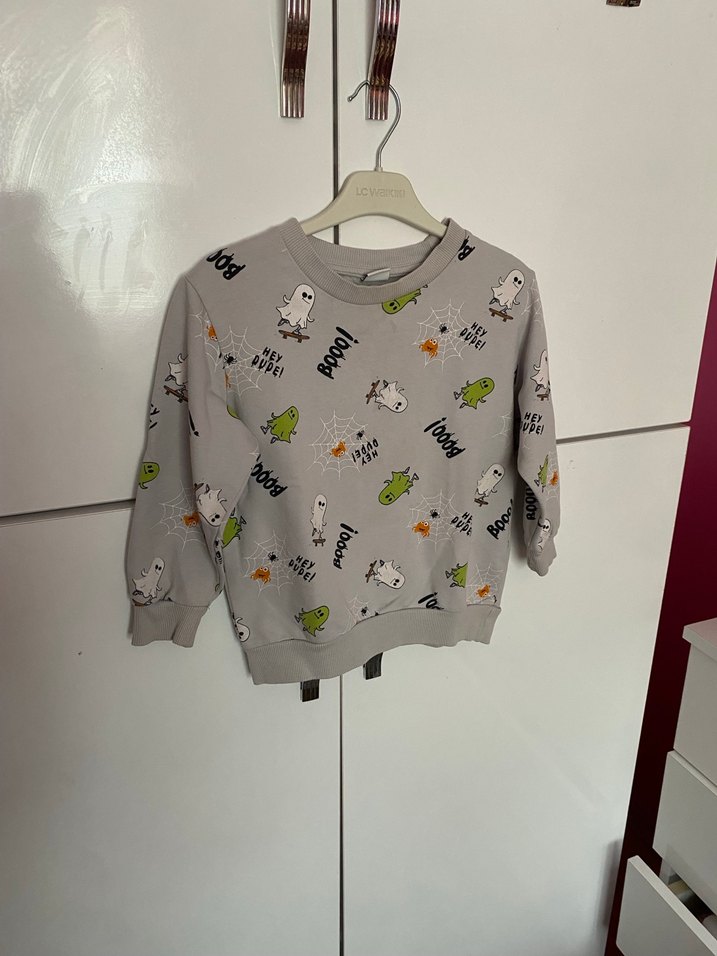 Gri renkli, baskılı desenli, uzun kollu ve yuvarlak yaka erkek çocuk sweatshirtü. Pamuklu örgü kumaştan, rahat kesimlidir.