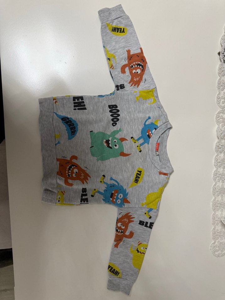 Uzun kollu, bisiklet yaka gri erkek çocuk sweatshirt. Renkli canavar baskıları ve örgü dokusuyla rahat ve salaş kesim.