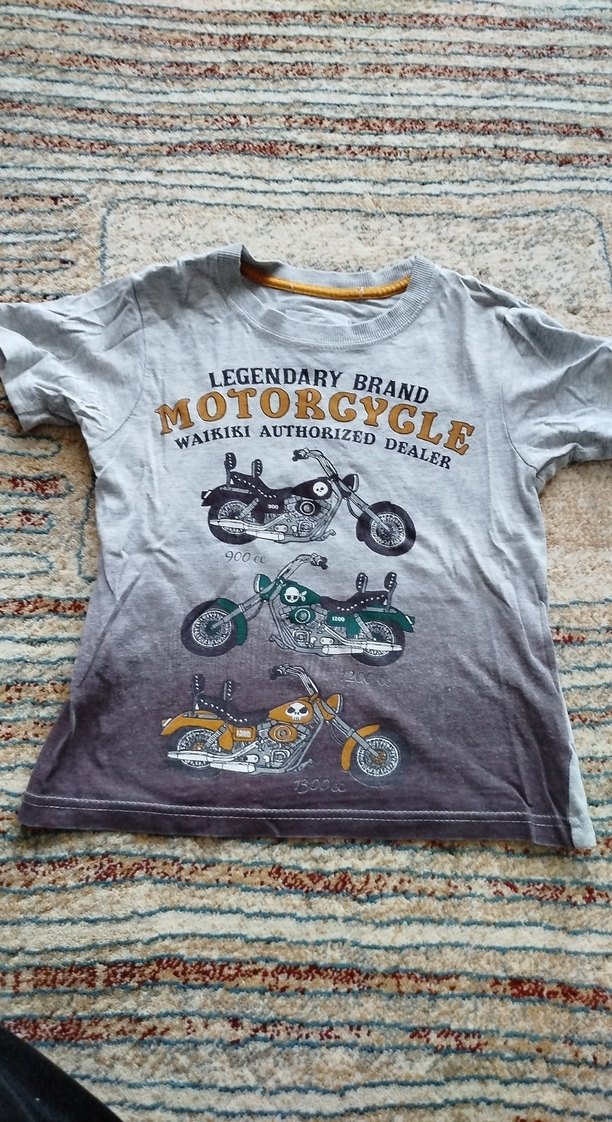 Pamuklu gri erkek çocuk tişörtü, kısa kollu ve yuvarlak yakalıdır. Baskılı motosiklet deseniyle rahat ve şık bir görünüm sunar. ️