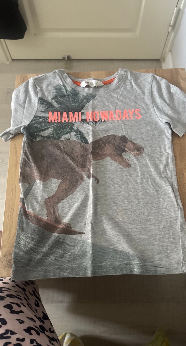 Gri renkli, kısa kollu, yuvarlak yakalı erkek çocuk tişörtü. Baskılı dinozor ve palmiye ağacı deseniyle sokak stiline uygun, rahat kesim ve sentetik kumaş.