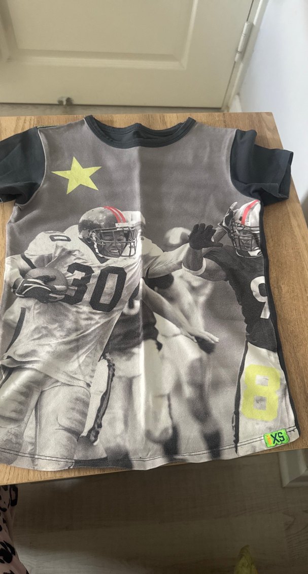 Gri tonlarda baskılı spor temalı, kısa kollu, bisiklet yaka ve sentetik kumaştan yapılmış erkek çocuk tişörtü. ⚡