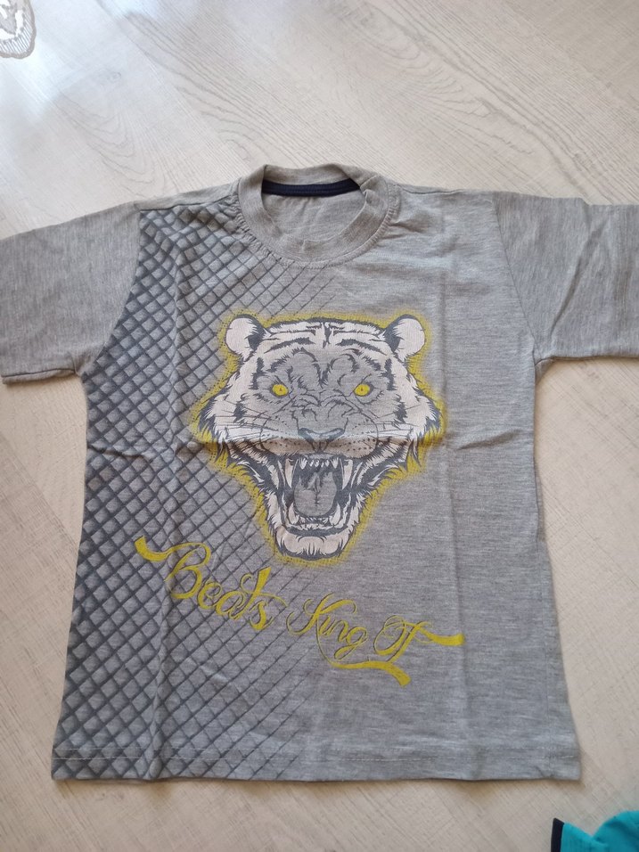 Gri renkli erkek çocuk tişörtü, baskılı kaplan yüzü ve bir yanından elmas desenli. Kısa kollu, yuvarlak yakalı ve bol kesimdir. adet fiyatidir..