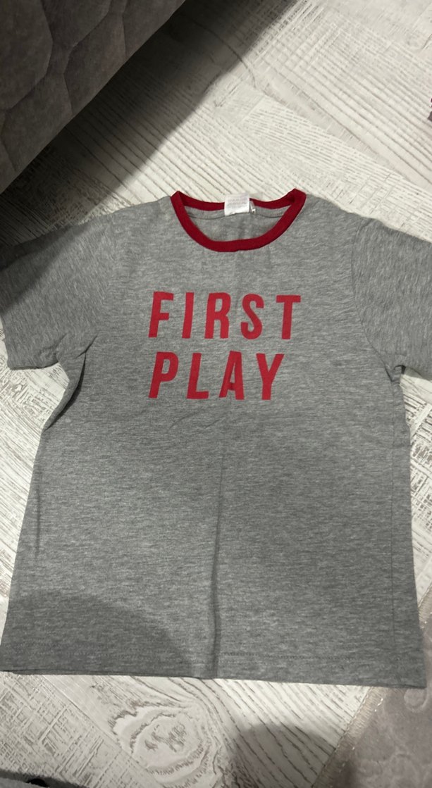 Kısa kollu, yuvarlak yaka, bol kesim gri erkek çocuk tişörtü. Kırmızı "FIRST PLAY" baskılı, rahat sokak stili.
