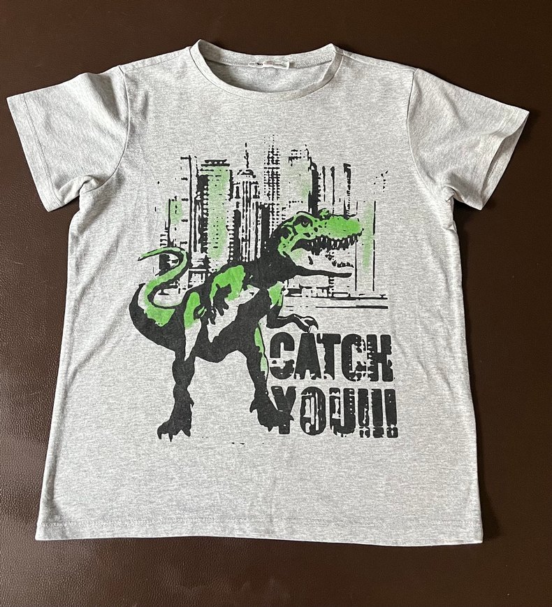 Gri renkli, pamuklu, kısa kollu, bisiklet yaka, bol kesim erkek çocuk tişörtü. Önünde yeşil baskılı dinozor ve şehir teması ile "CATCH" yazısı bulunur.