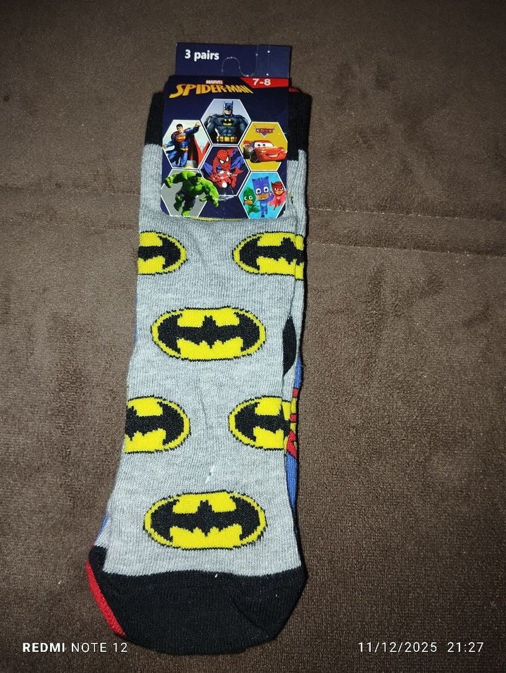 Baskılı süper kahraman figürlü gri erkek çorapları, 3 çift, 7-8 numara için uygun, rahat kesim.