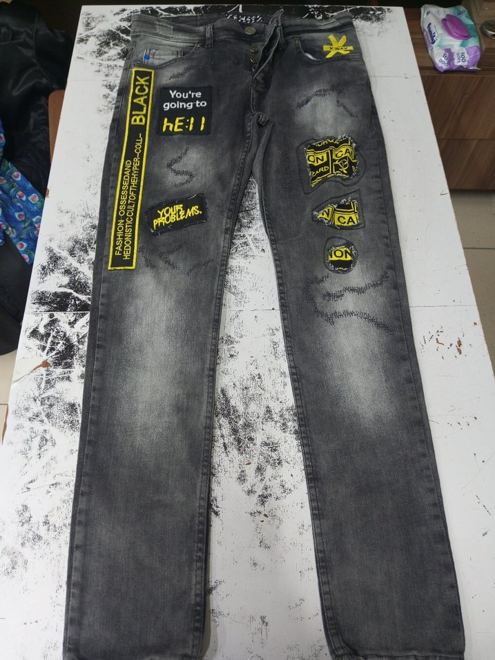 Gri renkli, baskılı detaylara ve tokalı süslemelere sahip regular fit denim pantolon. ölçüleri fotoğraflarda var