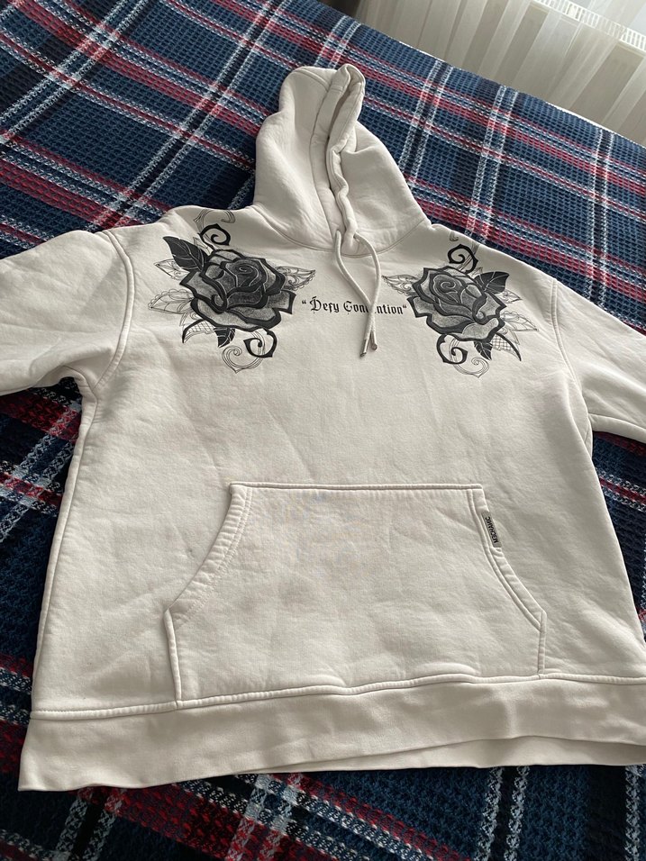 Erkekler için pamuklu, kapüşonlu, uzun kollu, bol kesim sweatshirt. Önünde gri baskılı gül deseni ve fermuarlı detay bulunur. Günlük rahat kullanım için uygundur.
