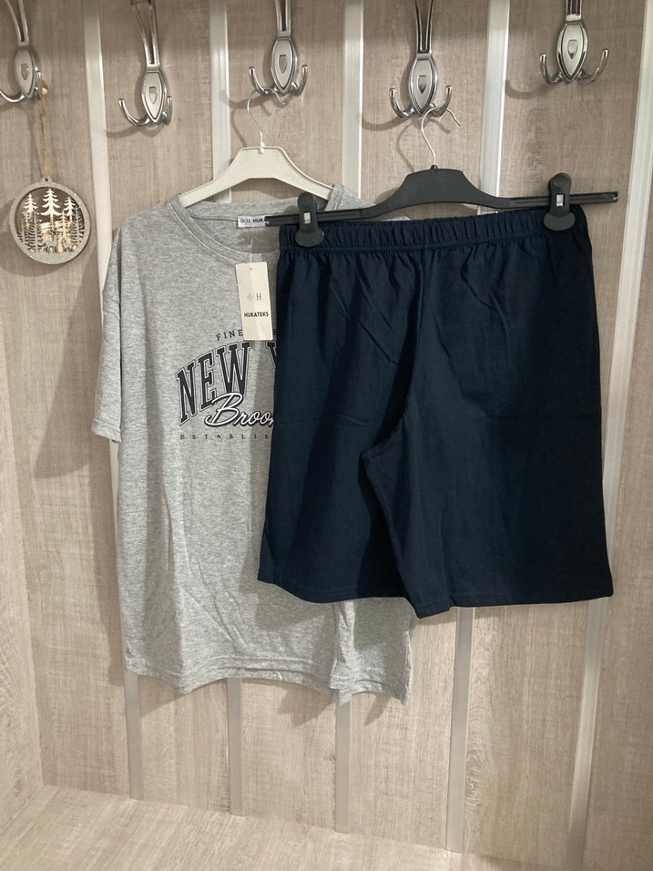 Gri baskılı kısa kollu üst ve koyu renk kısa paça şortlu, rahat ve salaş kesim erkek pijama takımı.Penyesi ikikoltuk arası genişlik 54 cm dir