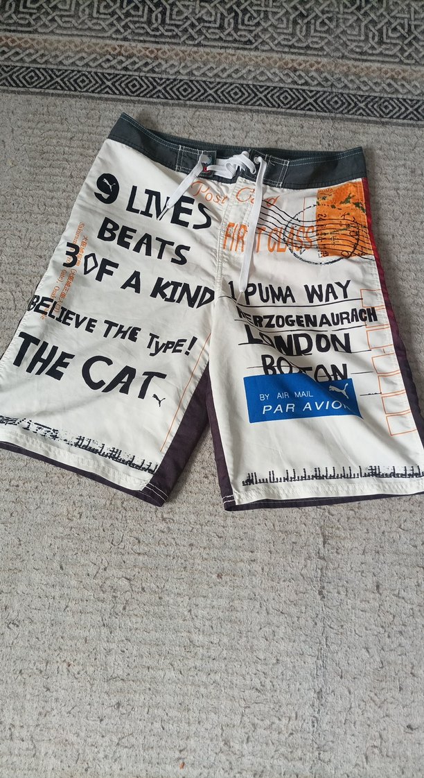 Gri renkli, baskılı desenlere sahip, bol kesim erkek midi deniz şortu. Sokak stilini yansıtan yazılı ve grafik detaylar içerir. Plaj kullanımı için uygundur.