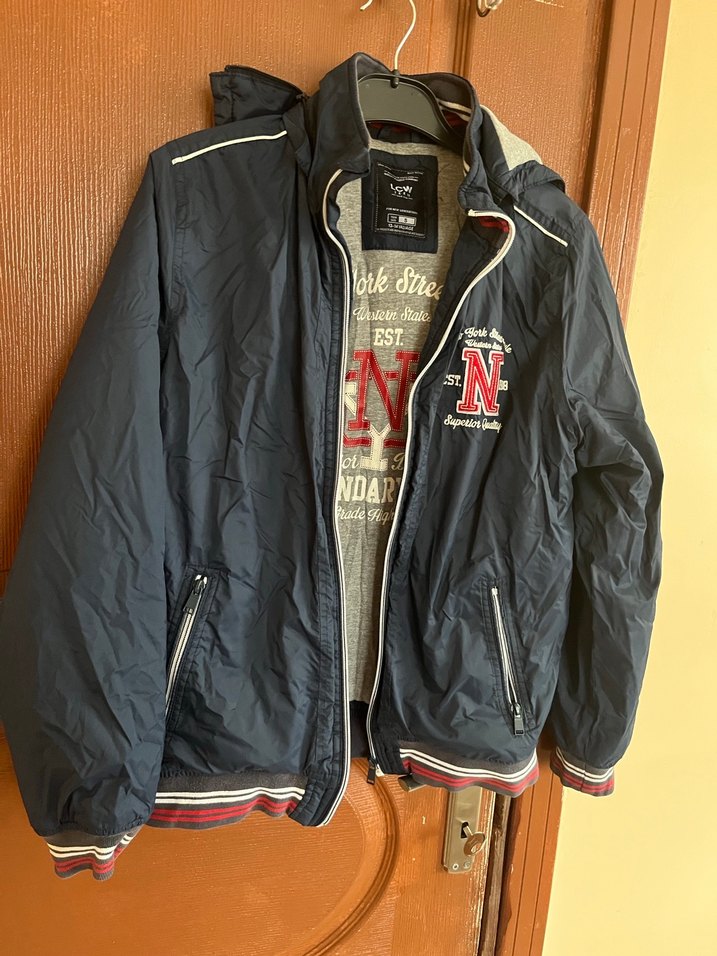 Gri baskılı, sentetik kumaştan yapılmış, normal boyda ve bol kesim erkek streetwear ceketi. Uzun kollu ve fermuarlı, günlük kullanım için uygundur.