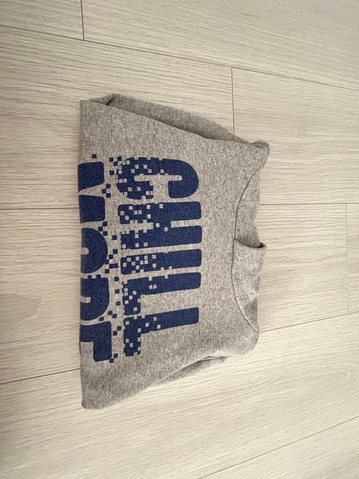 Geniş kesim gri sweatshirt, uzun kollu ve yuvarlak yaka. Örme dokusu ve üzerinde 'CHILL' baskısı bulunur, rahat sokak stili için uygundur. ❄️