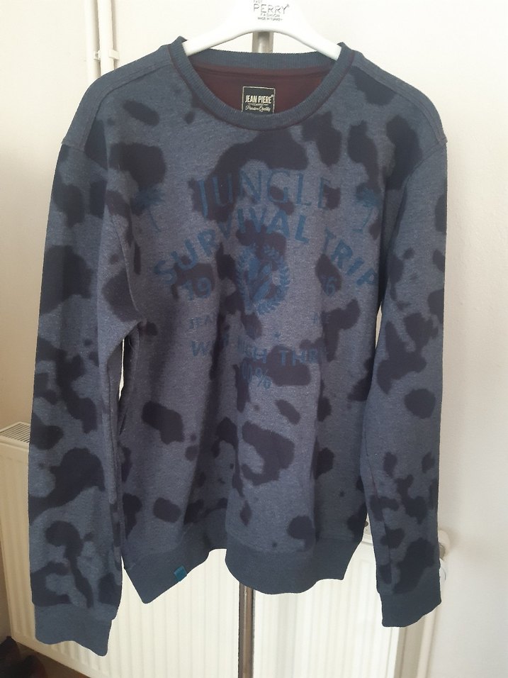 Gri baskılı, yuvarlak yaka ve uzun kollu erkek sweatshirtü. Yumuşak örme kumaştan, bol kesim ve günlük sokak stili için uygun.