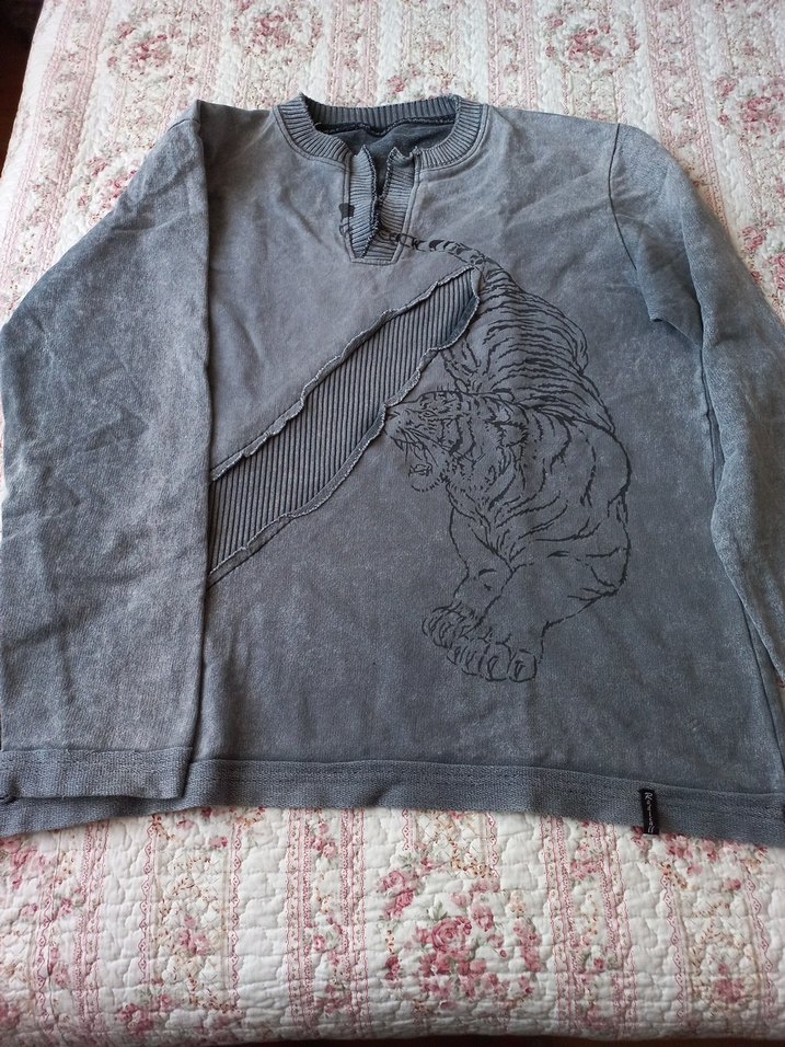 Gri renkli, baskılı kaplan deseni ve örgü detaylı, rahat kesim uzun kollu koltuk altı 58 cm boy 68 cmPamuklu ve yumuşak keten kumaştan, yuvarlak yakalı, sokak modasına uygun.