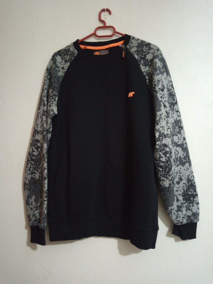 Gri baskılı kollara ve bisiklet yaka tasarıma sahip, rahat kesim erkek sweatshirt. Yumuşak ve sıcak kumaştan üretilmiş, günlük kullanıma uygun şık ve rahat bir parça.