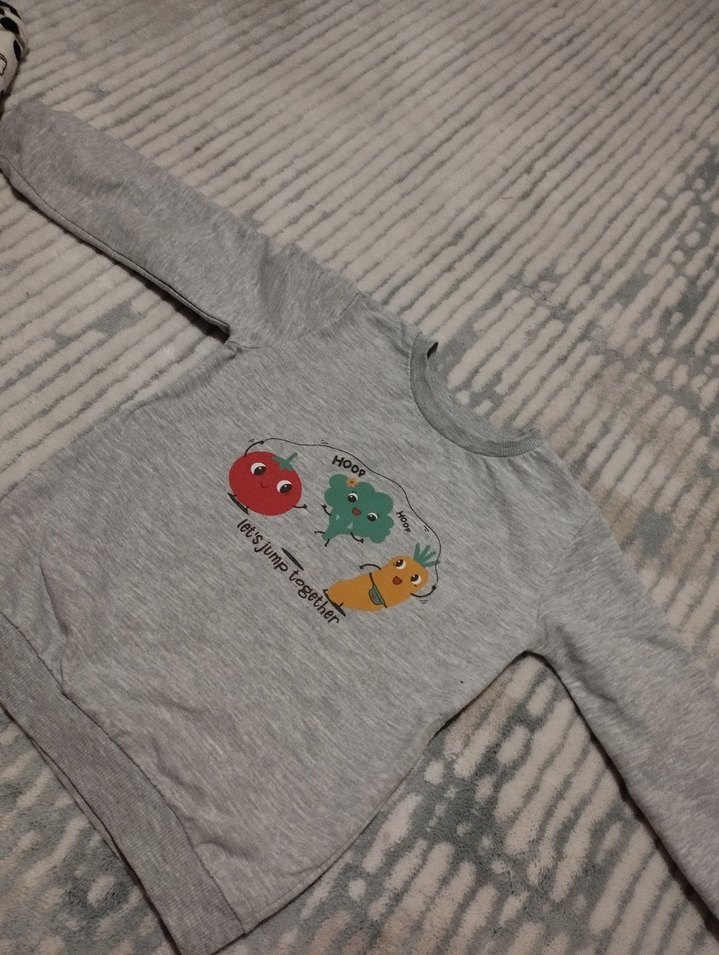 Gri renkli, uzun kollu ve yuvarlak yakalı erkek sweatshirtü. Baskılı sevimli figürler ve düğme detayları bulunur. Yumuşak, sıcak kumaştan üretilmiştir. temiz kullanılmıştır. bir sorunu yoktur e bebekten alındı 5 yaş ama ben 4 yaşında giydirdim ölçüleri belirtildi#lcw #defacto #hm #koton #zara #çocuk