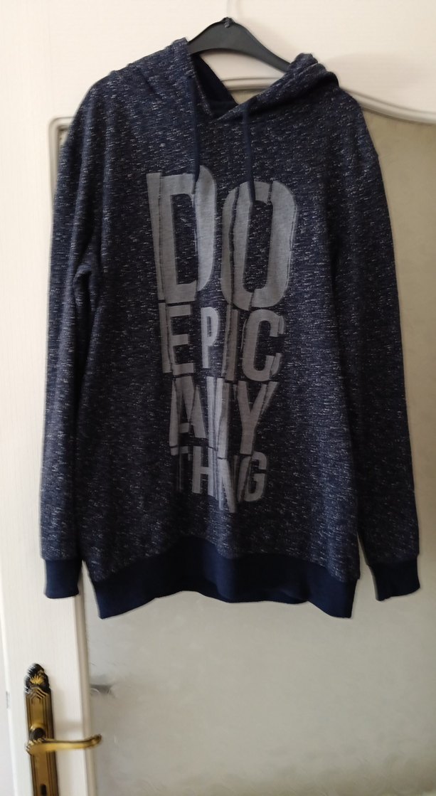 Koyu gri renkte, uzun kollu, bisiklet yaka ve bol kesim erkek sweatshirt. Örme denim kumaştan üretilmiş, ön tarafında baskı deseni bulunur. Günlük kullanıma uygundur.
