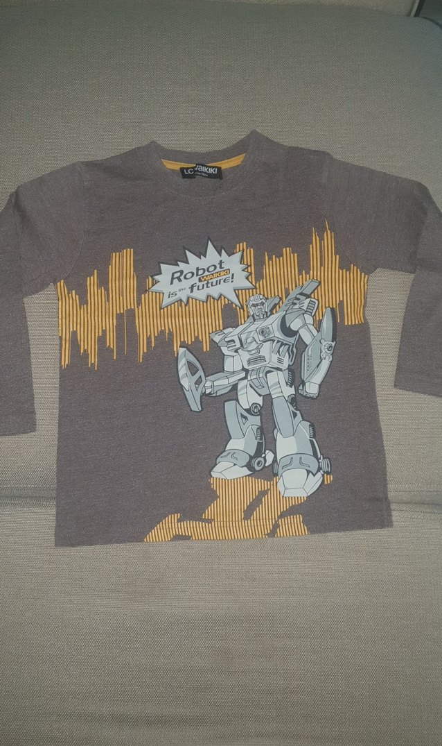 Gri uzun kollu, bol kesim erkek sweatshirt. Robot baskısı ve düğme detayı bulunur. Rock punk tarzı.