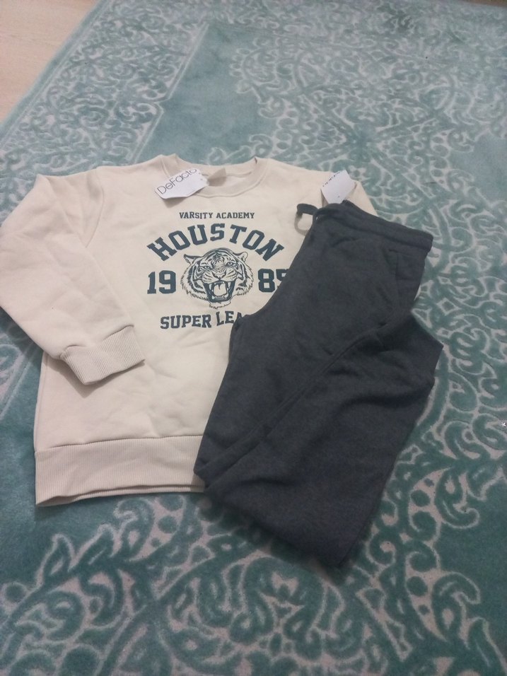 Pamuklu, baskılı sweatshirt ve gri eşofman altından oluşan rahat kesim erkek takımı, günlük sokak stili için uygun.