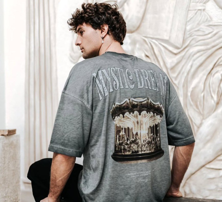 Gri denim kumaştan, baskılı atlıkarınca ve "Mystic Dream" yazılı, salaş kesim kısa kollu erkek tişörtü. Bisiklet yaka, sokak stili etkisiyle.