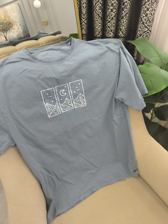 Pamuklu, gri, kısa kollu ve yuvarlak yakalı bol kesim tişört. Minimalist dağ ve ay baskısı ile günlük kullanıma uygun.