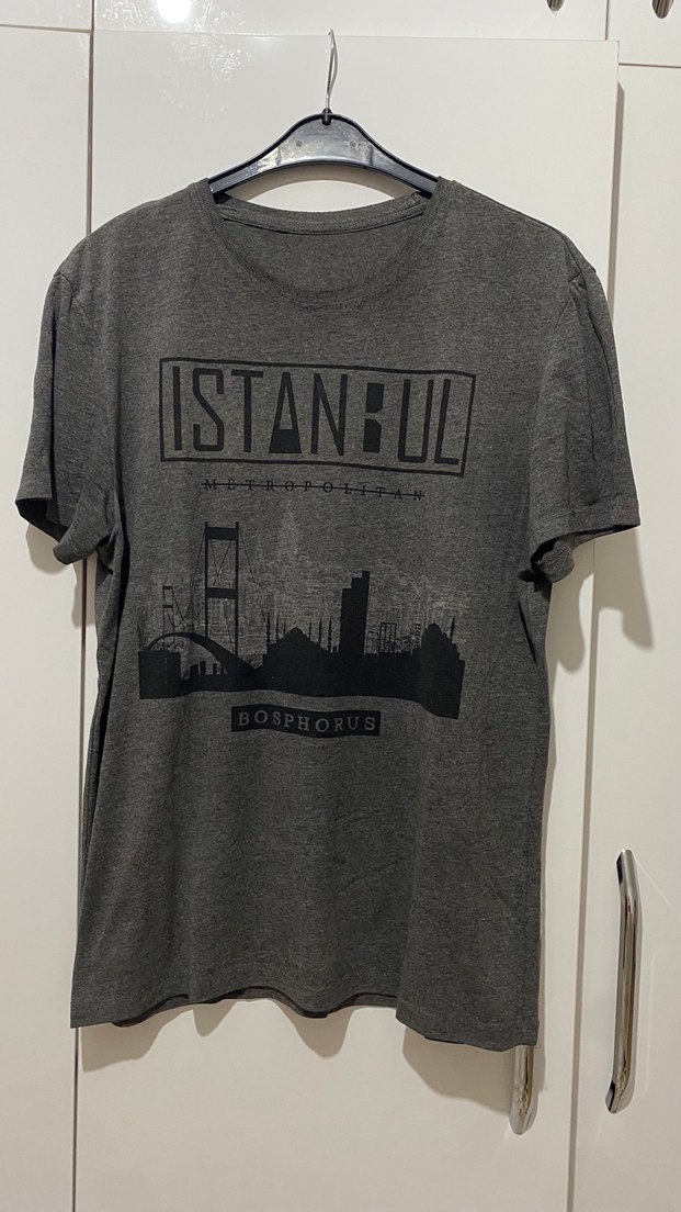 Gri, baskılı İstanbul silüeti ve yazılı, kısa kollu, yuvarlak yaka, bol kesim erkek tişörtü. Günlük sokak stili için uygun. ️