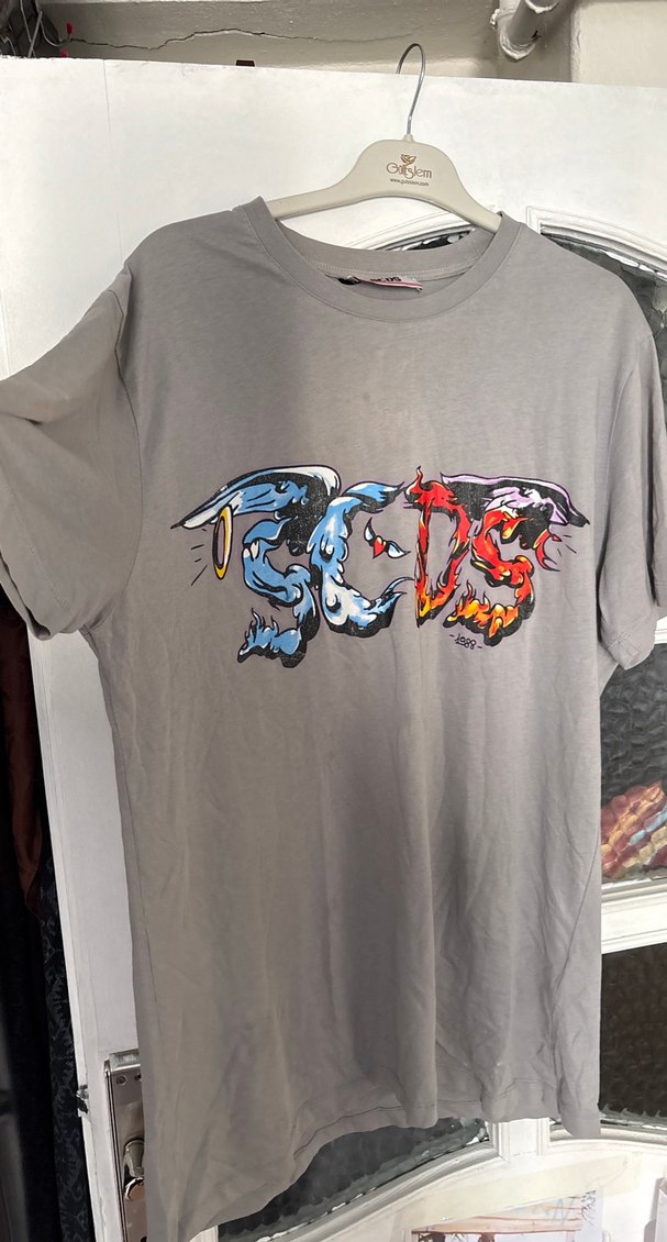 Gri renk, yuvarlak yaka, bol kesim erkek tişörtü. Renkli baskı ve tokalı detaylarla sokak stiline uygun, yumuşak dokulu kumaştan üretilmiştir.