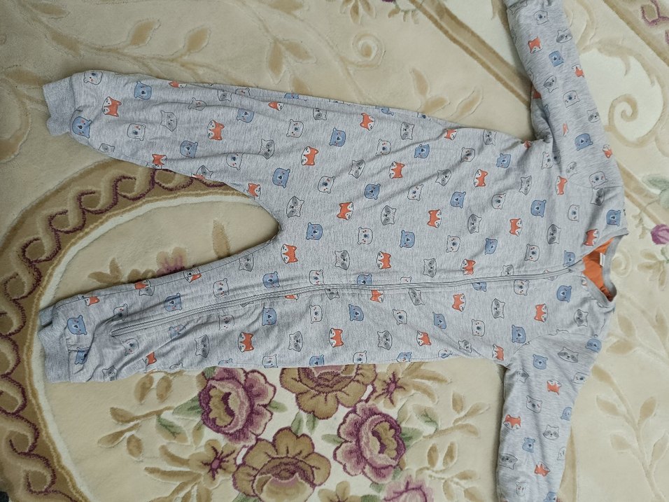 Gri renkli, uzun kollu, bisiklet yaka ve fermuarlı bebek tulumu. Yumuşak sentetik kumaştan, baskılı desenlidir. Sokak tarzı için uygun.
