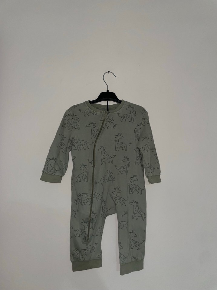 Uzun kollu, bisiklet yaka ve fermuarlı gri bebek tulumu. Yumuşak ve sıcak kumaştan, baskılı zürafa desenli 2 yaş 93 cm