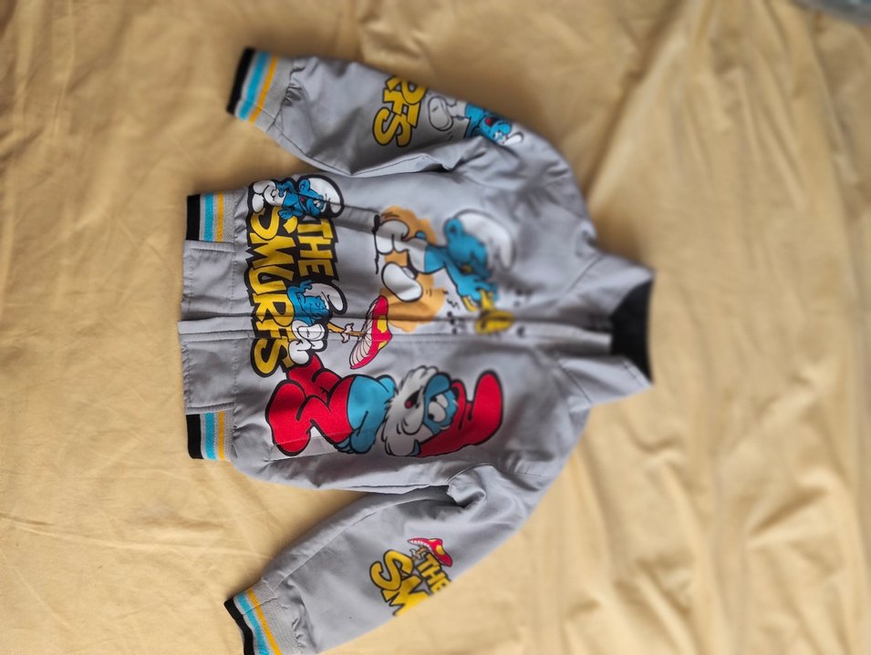 Fermuarlı, bisiklet yaka, gri ve baskılı Smurfs desenli, fit kesim erkek çocuk ceketi.