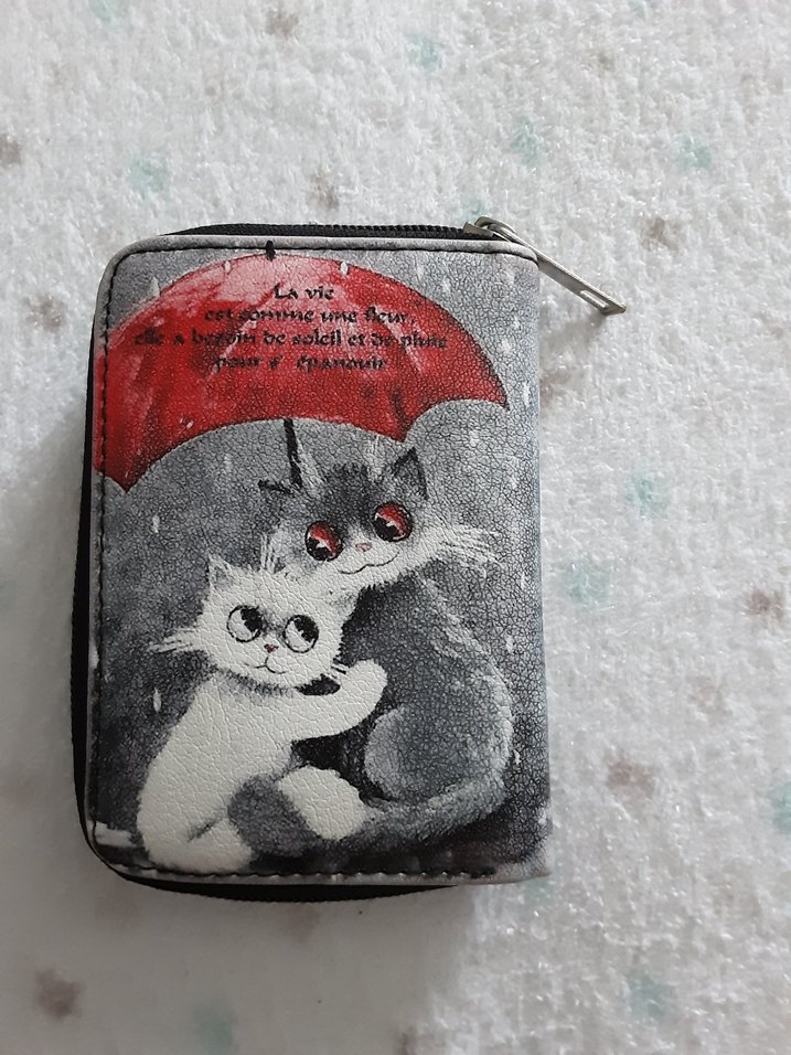 İki kedili baskılı gri kadın cüzdanı, kırmızı şemsiye motifi ile. Fermuarlı ve yumuşak, sıcak kumaştan yapılmıştır. herhangi bir yerinde kusuru yoktur