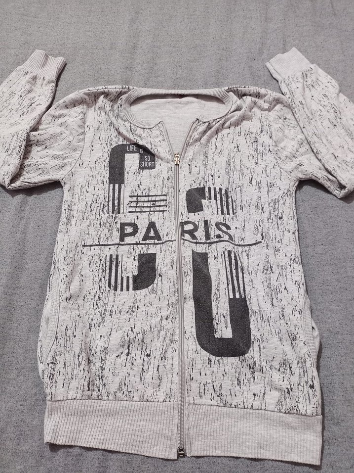 uzun kollu, yuvarlak yaka, bol kesim gri baskılı sentetik kumaştan fermuarlı sweatshirt. Sokak modasına uygun rahat bir parça.