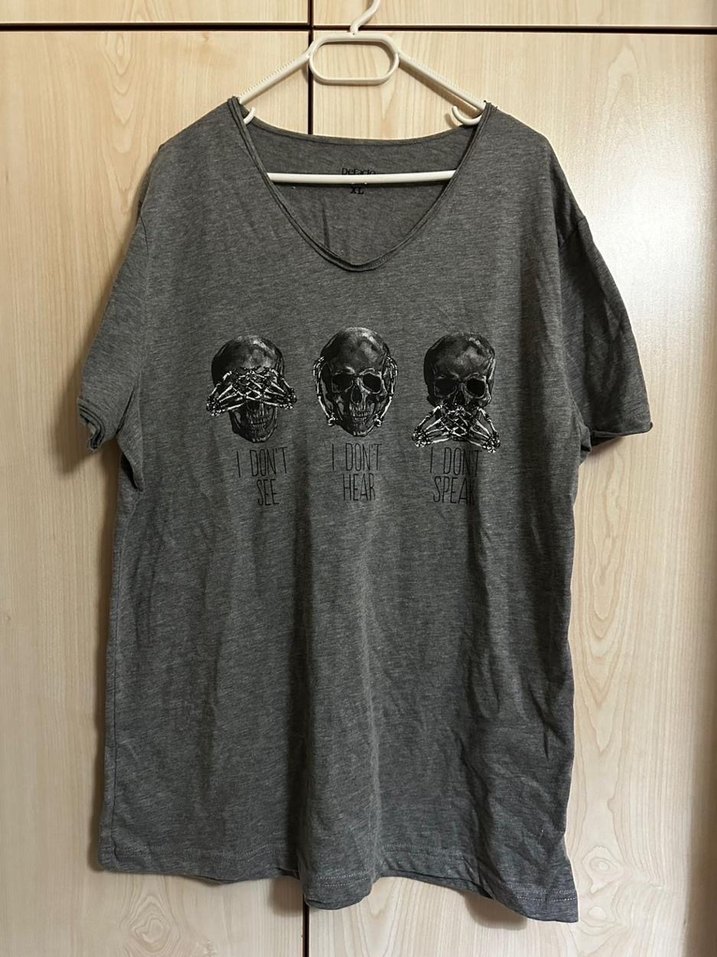 Gri renkli, kısa kollu ve yuvarlak yakalı hamile tişörtü. Üzerinde 'görme, duyma, konuşma' temalı üç kafatası baskısı bulunur. Rahat kesimli ve yumuşak keten kumaştan günlük kullanım için uygundur.