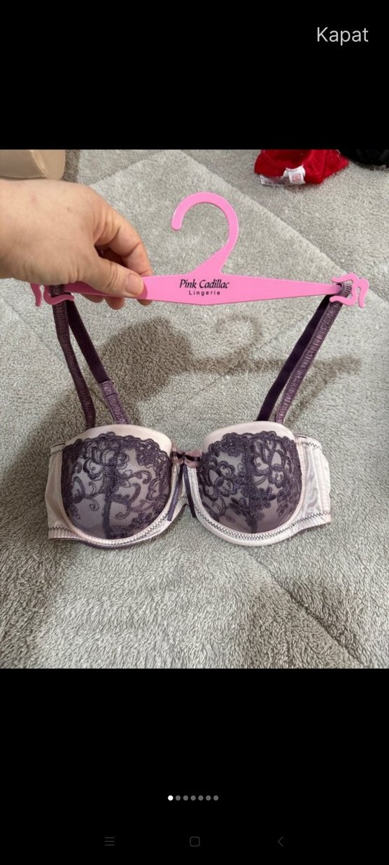 Paris tarzı sütyen, yumuşak pembe taban üzerinde gri baskılı dantel ile gotik detaylara sahip. Ayarlanabilir askılı ve normal uzunlukta.
